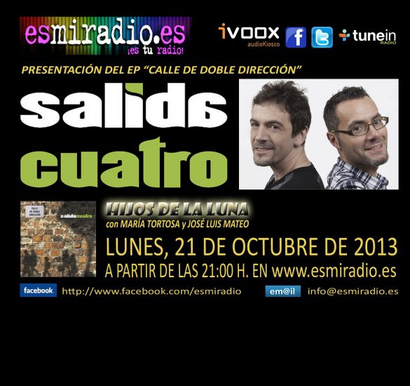 Bookmark esmiradioNoticiasPróximos Invitados El próximo Lunes 21 de Octubre «Salida Cuatro» nos presenta «Calle de doble dirección» en Hijos de la Luna por esmiradio 16/10/2013 por esmiradio 16/10/2013 0 minutos de lectura Leer más